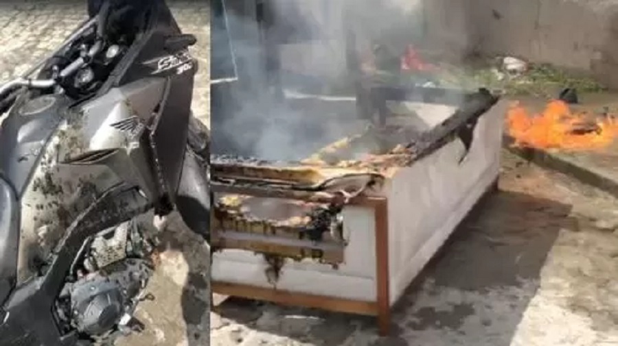 O homem jogou gasolina nos móveis e em uma motocicleta modelo Sahara, depois ateou fogo, essa moto O km custa aproximadamente 36 mil reais.