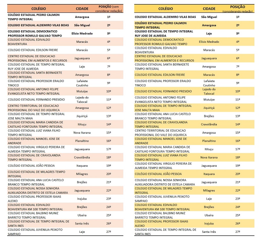 Além de dominarem o ranking do NTE09, as referidas instituições de Amargosa e de São Miguel das Matas também superaram as escolas estaduais de cidades vizinhas de outros polos educacionais, como Santo Antônio de Jesus, Valença e Itaberaba, demonstrando a qualidade do ensino oferecido. O desempenho é ainda mais impressionante em nível estadual: o Pedro Calmon e o Aldemiro Vilas Boas ficaram entre as 60 melhores escolas da Bahia, em um ranking que inclui cerca de 1000 instituições em todo o estado.