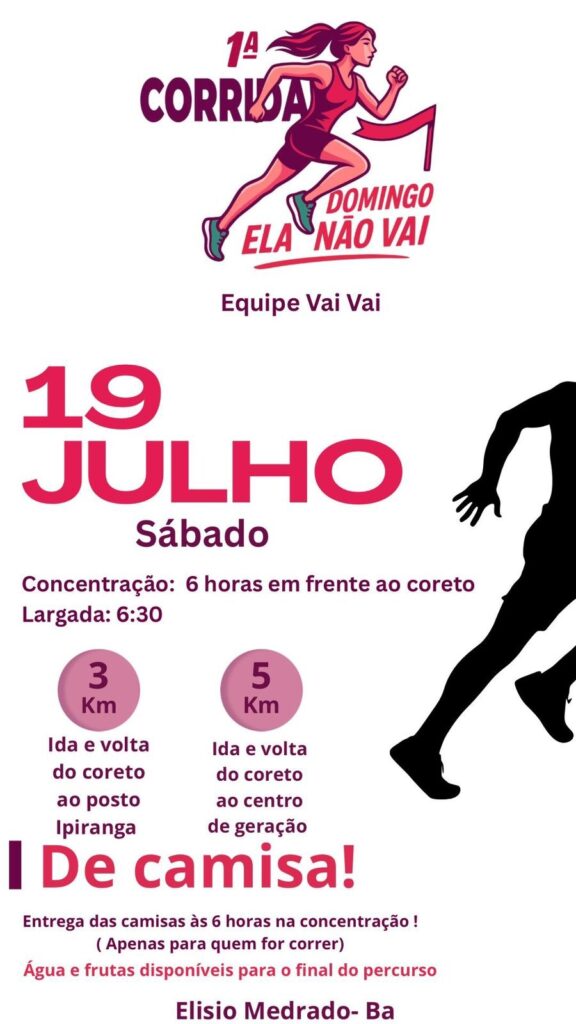 O grupo de corrida de Elísio Medrado “Equipe Vai Vai” realizará na manhã deste sábado (19) a primeira corrida “Domingo Ela não vai”.