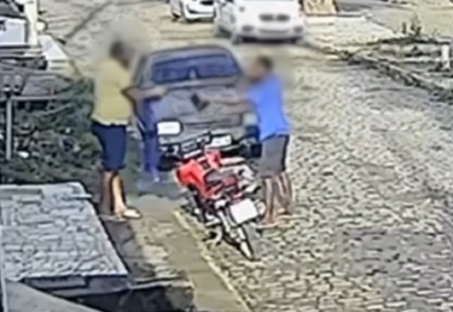 A imagem mostra a vítima estava sentada no passeio da rua, quando um homem de camisa azul abordou, anunciou o assalto e levou alguns objetos de valor.