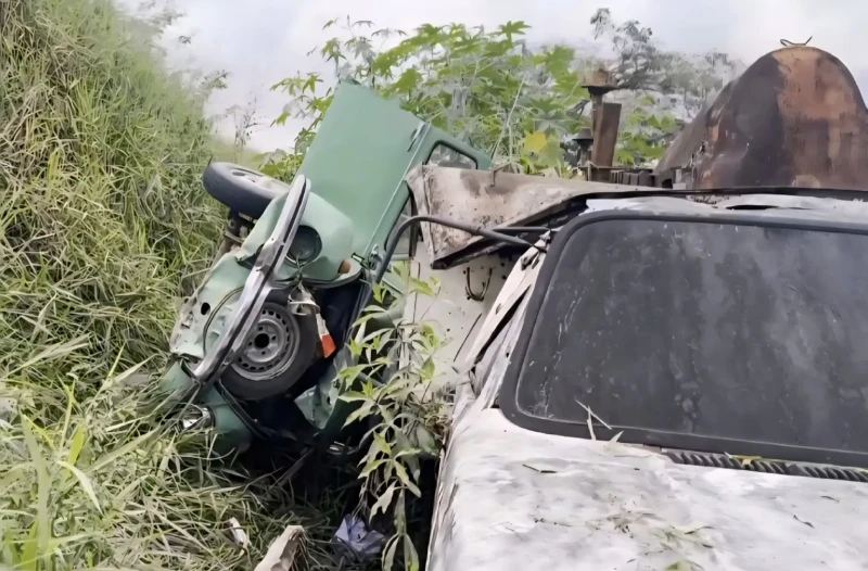 O carro atravessou a via, entrou em uma área de pasto e caiu sobre a sucata de um caminhão-caçamba.