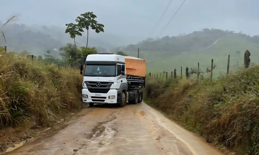 Um carreteiro ficou impedido de seguir viagem por algumas horas após pegar o caminho errado e parar na estrada que liga Mutuípe e Serra Grande, em Valença.