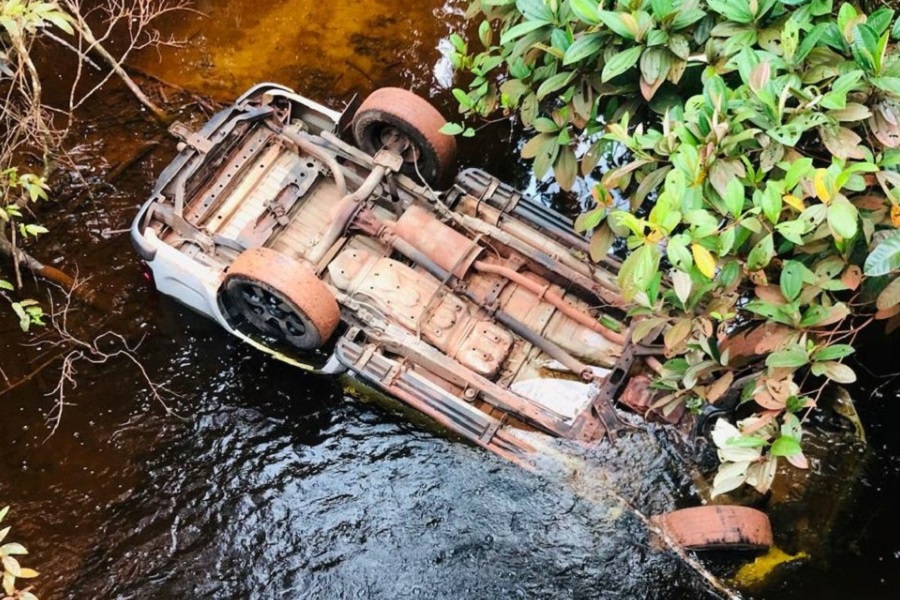 Um motorista perdeu o controle da direção e a caminhonete caiu da ponte, ficando com as quatro rodas para cima dentro do rio.