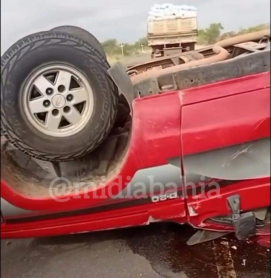 Imagens registradas após a ocorrência mostram a caminhonete virada às margens da rodovia, com os pneus para cima.
