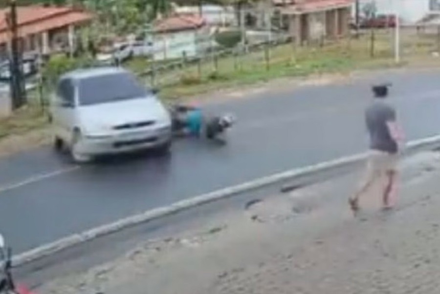 Com o impacto, o capacete se soltou da cabeça do motociclista, ele conseguiu se levantar, caminhou até uma área de calçamento ao lado de estabelecimentos comerciais e deitou no chão.